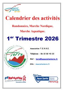 Ce trimestre Calendrier 1ier trimestre 2026 Calendrier 4ième trimestre 2025 Calendrier 2ième trimestre 2025 Calendrier 1er trimestre 2025 Calendrier 4ème trimestre 2024 Calendrier 2ème trimestre 2024 Calendrier 1er trimestre 2024 Calendrier 4ième trimestre 2023 Calendrier 2ième trimestre 2023 Calendrier 1er trimestre 2023 Calendrier Novembre et Décembre 2022 Calendrier Septembre et Octobre 2022 Calendrier du 2ième trimestre 2022 Calendrier du 1er trimestre 2022 Association Terre Association Terre – Fédération Française de Randonnée Pédestre La vie du club Nos Activités Fil d’actualités Nous contacter Association TERRE - Randonnées - Marche Nordique - Marche Aquatique - Rando-Santé Association TERRE - Randonnées - Marche Nordique - Marche Aquatique - Rando-Santé