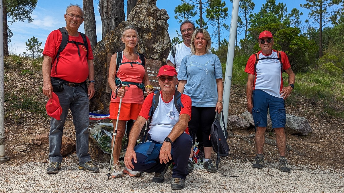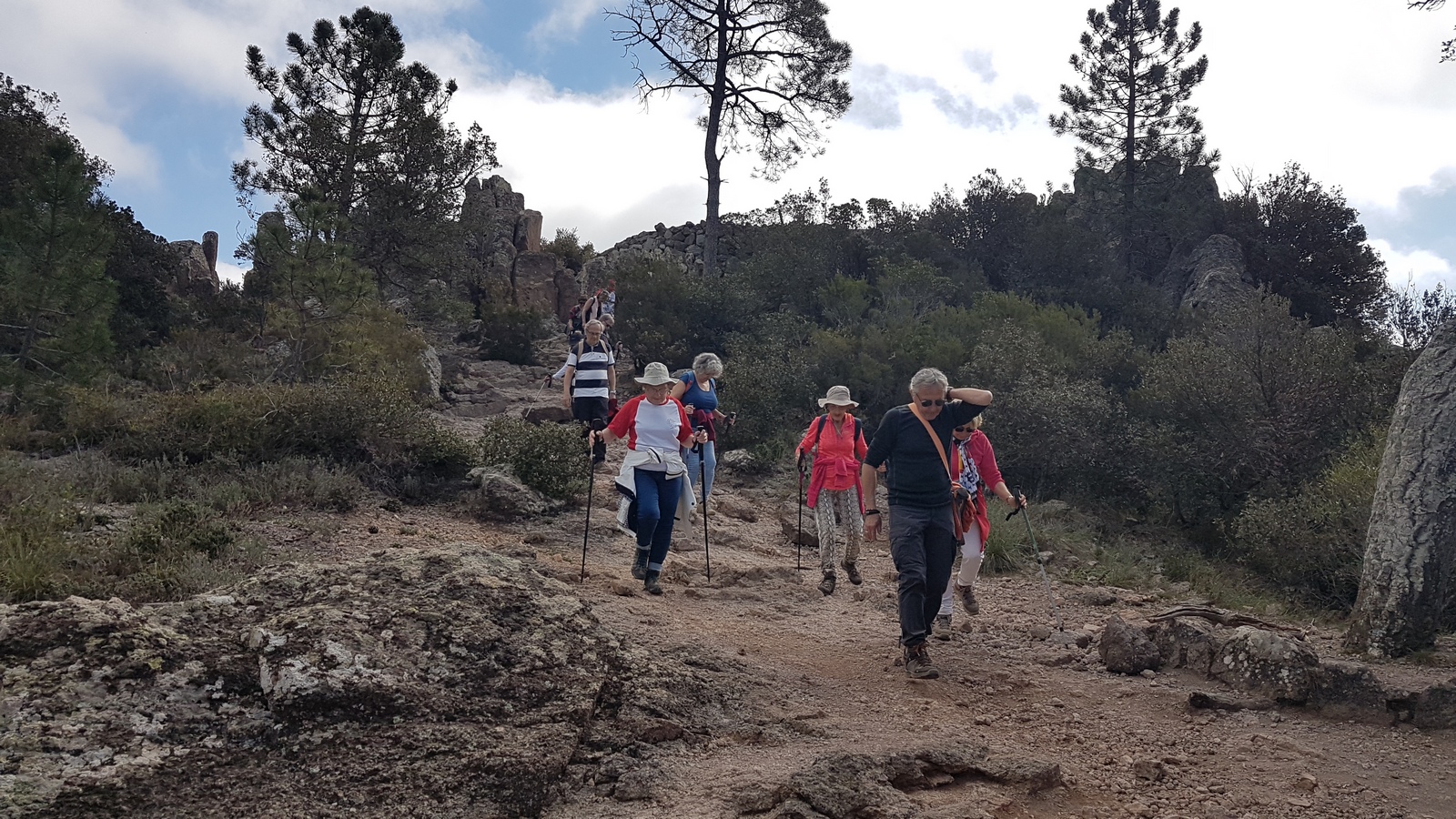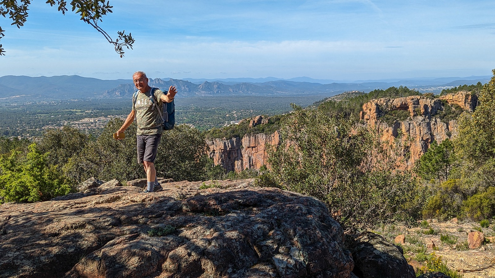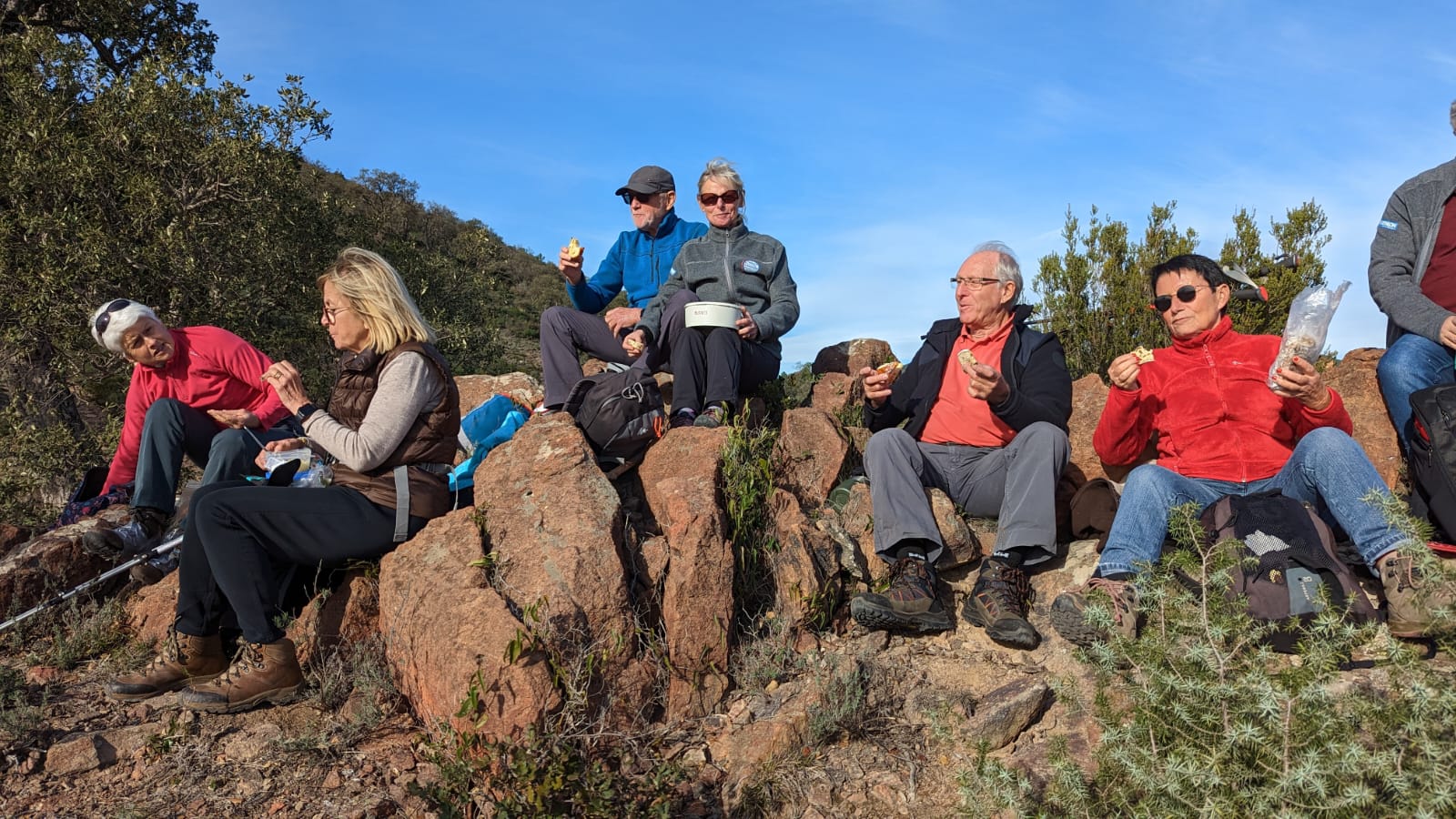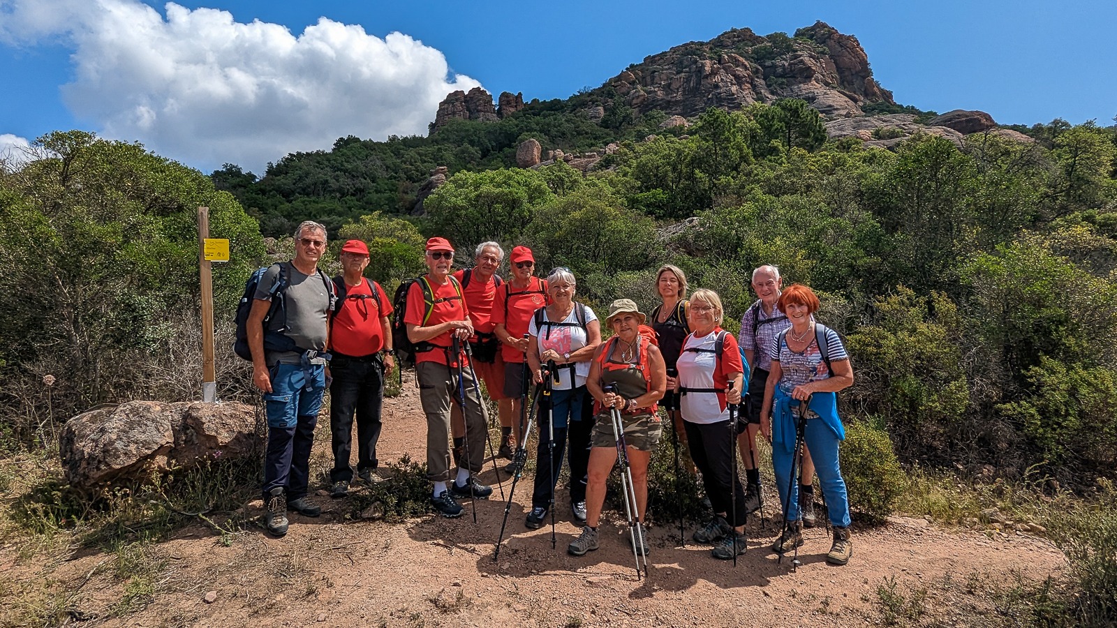 Un peu plus loin, après avoir quitté la route au niveau du monument en hommage à la famille de Martin Gray (son épouse et ses quatre enfants) disparue tragiquement lors du grand incendie du Tanneron en octobre 1970, nous sacrifions à la traditionnelle pause banane, confortablement installés et appuyés contre une paroi de rochers blonds et fauves qui ne sont pratiquement plus de l’Estérel, mais déjà des Maures.