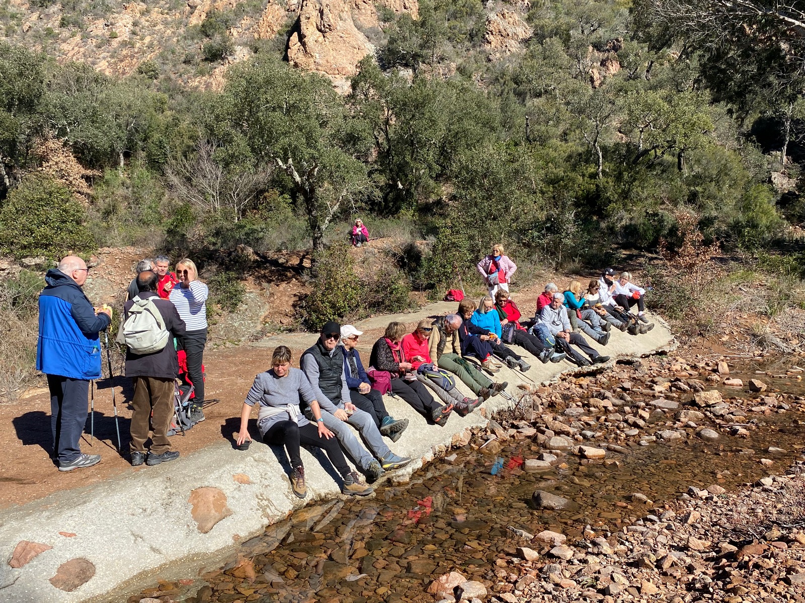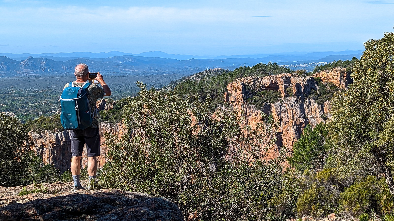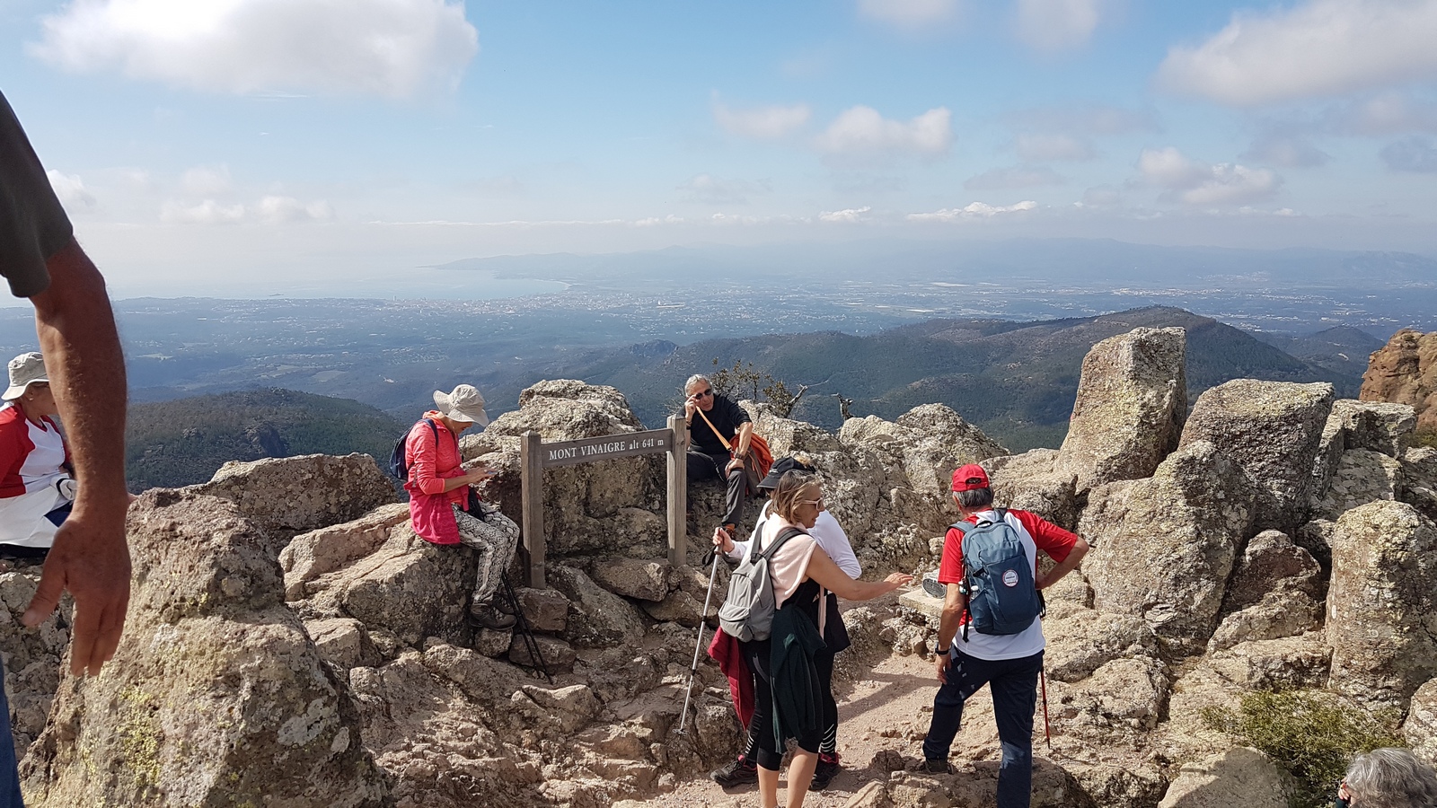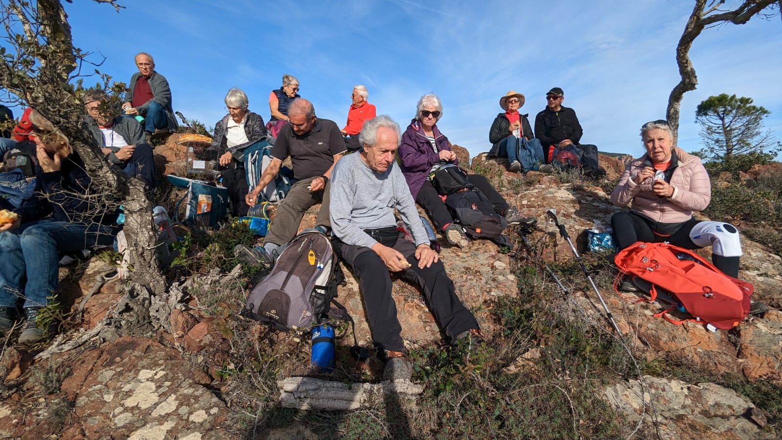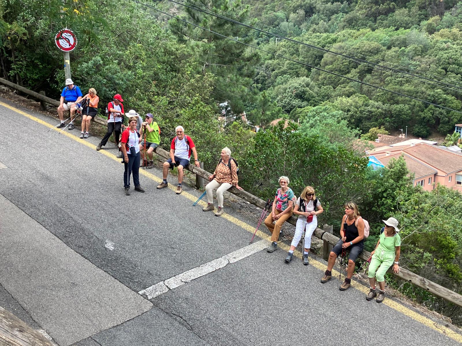 Un peu plus loin, après avoir quitté la route au niveau du monument en hommage à la famille de Martin Gray (son épouse et ses quatre enfants) disparue tragiquement lors du grand incendie du Tanneron en octobre 1970, nous sacrifions à la traditionnelle pause banane, confortablement installés et appuyés contre une paroi de rochers blonds et fauves qui ne sont pratiquement plus de l’Estérel, mais déjà des Maures.