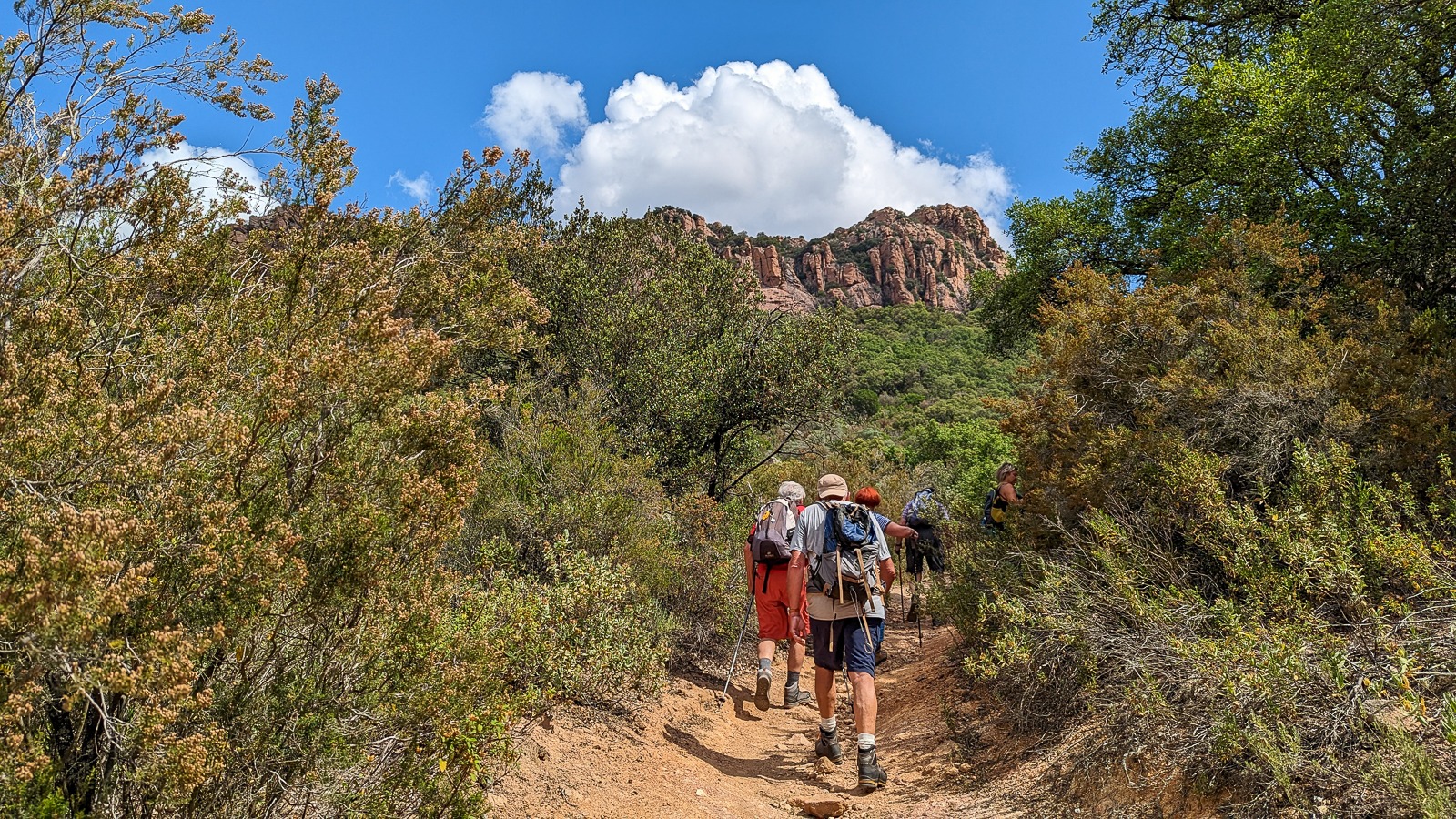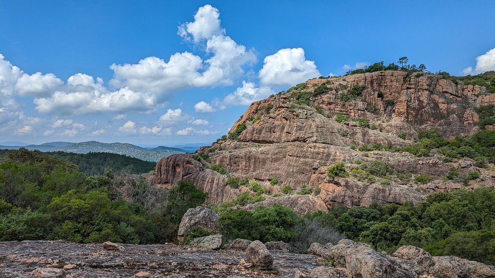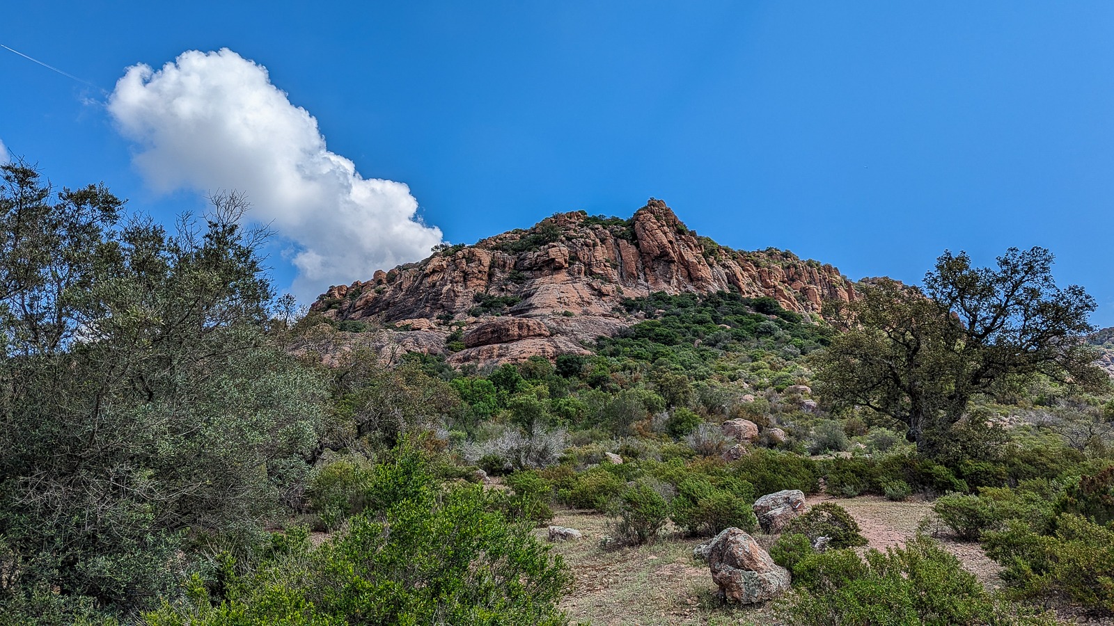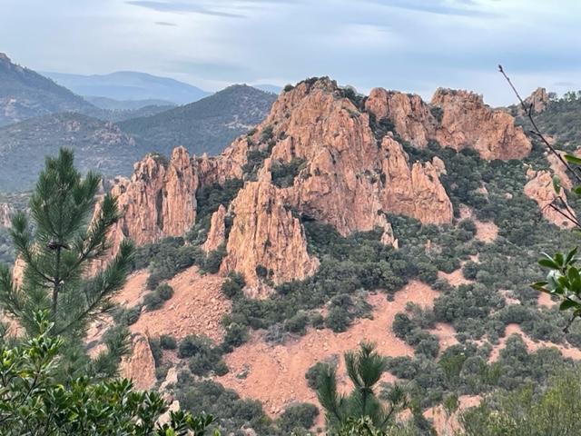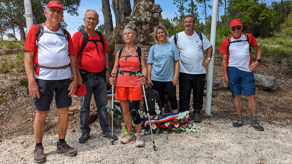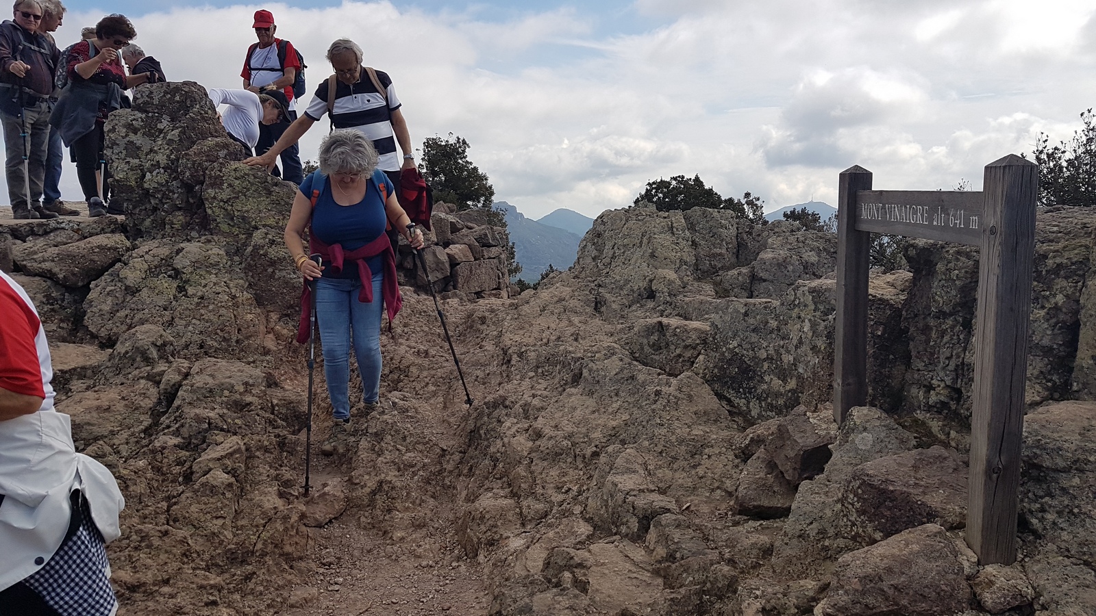 Un peu plus loin, après avoir quitté la route au niveau du monument en hommage à la famille de Martin Gray (son épouse et ses quatre enfants) disparue tragiquement lors du grand incendie du Tanneron en octobre 1970, nous sacrifions à la traditionnelle pause banane, confortablement installés et appuyés contre une paroi de rochers blonds et fauves qui ne sont pratiquement plus de l’Estérel, mais déjà des Maures.