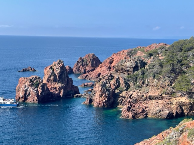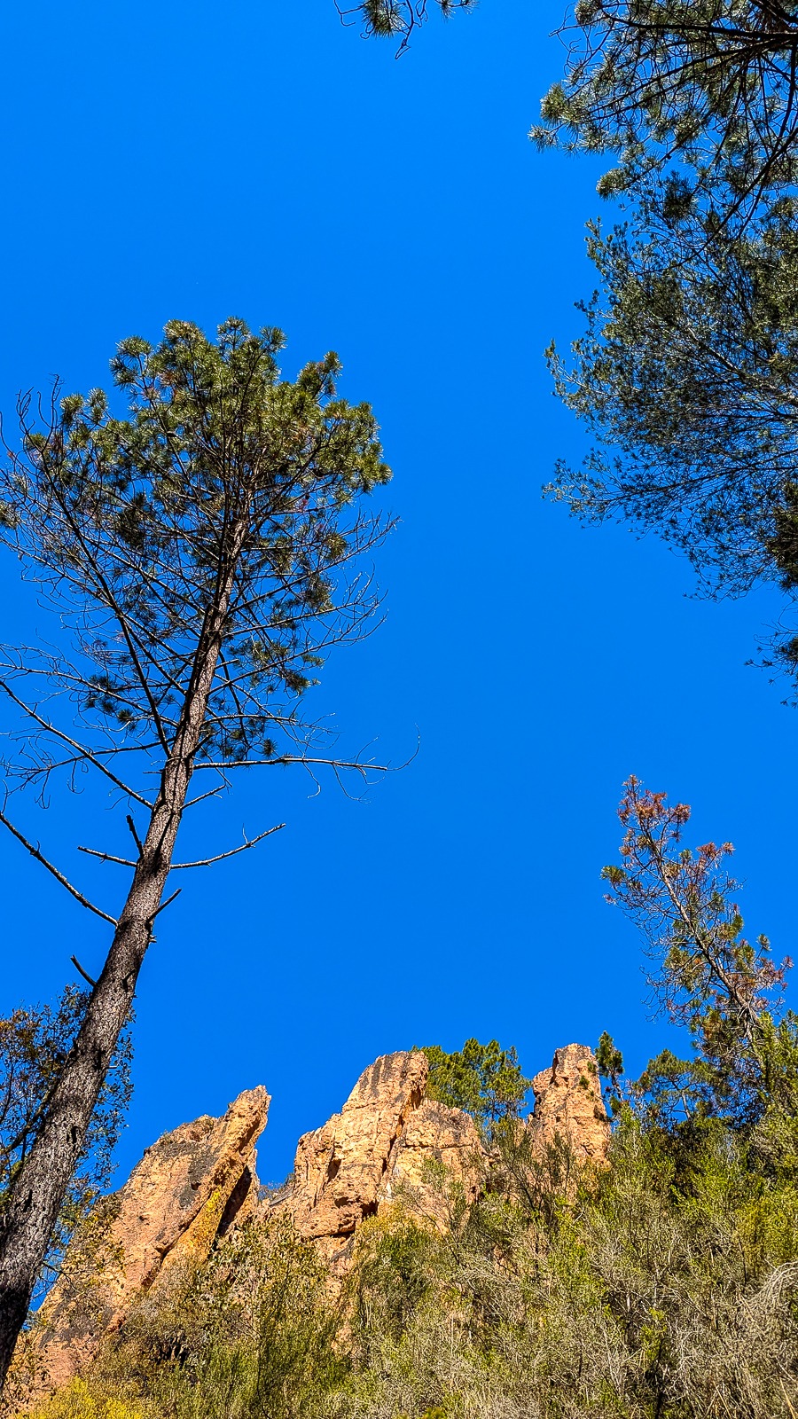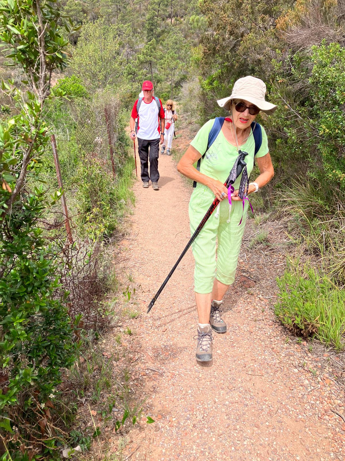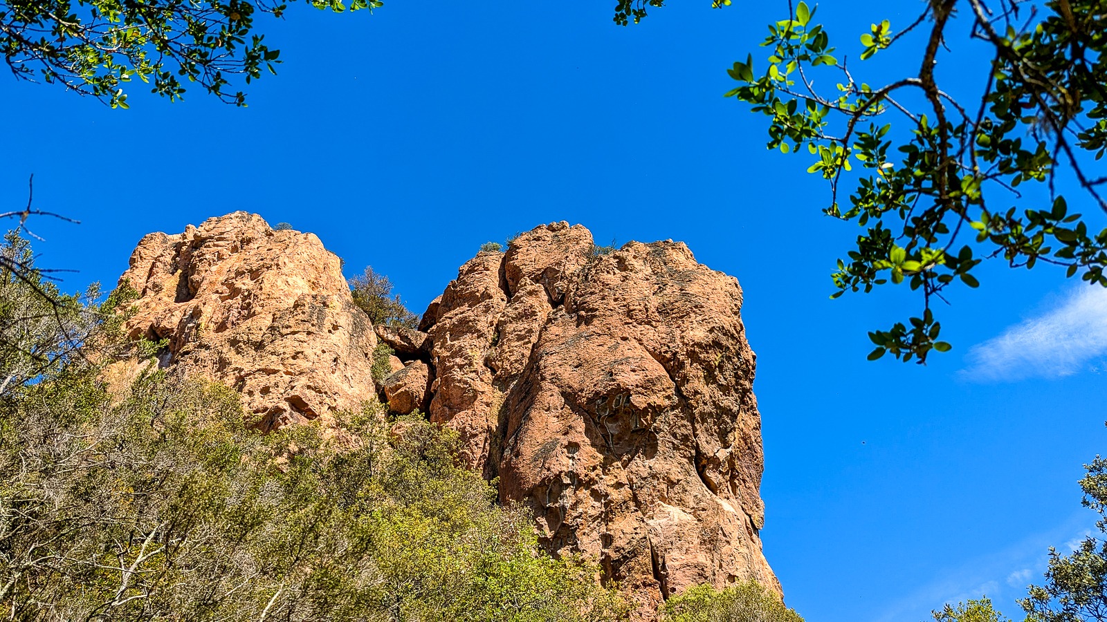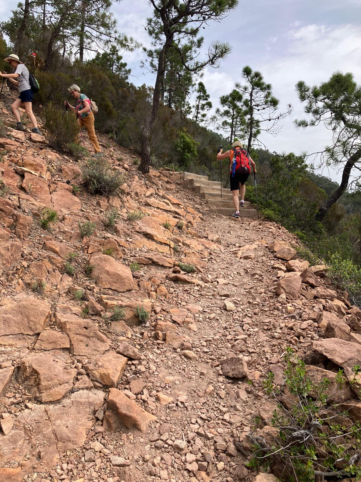 Un peu plus loin, après avoir quitté la route au niveau du monument en hommage à la famille de Martin Gray (son épouse et ses quatre enfants) disparue tragiquement lors du grand incendie du Tanneron en octobre 1970, nous sacrifions à la traditionnelle pause banane, confortablement installés et appuyés contre une paroi de rochers blonds et fauves qui ne sont pratiquement plus de l’Estérel, mais déjà des Maures.