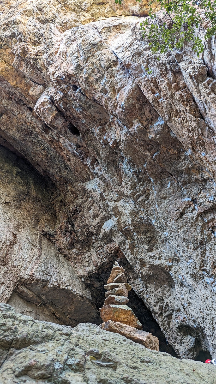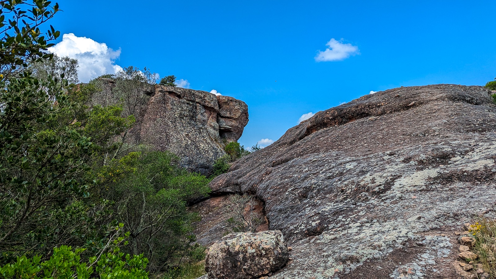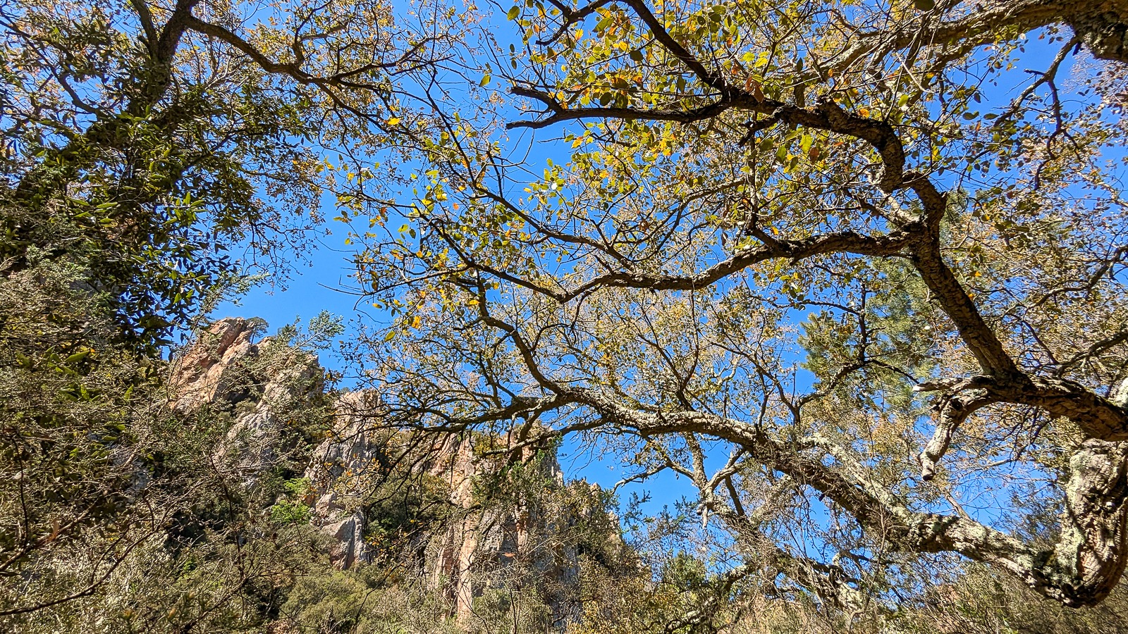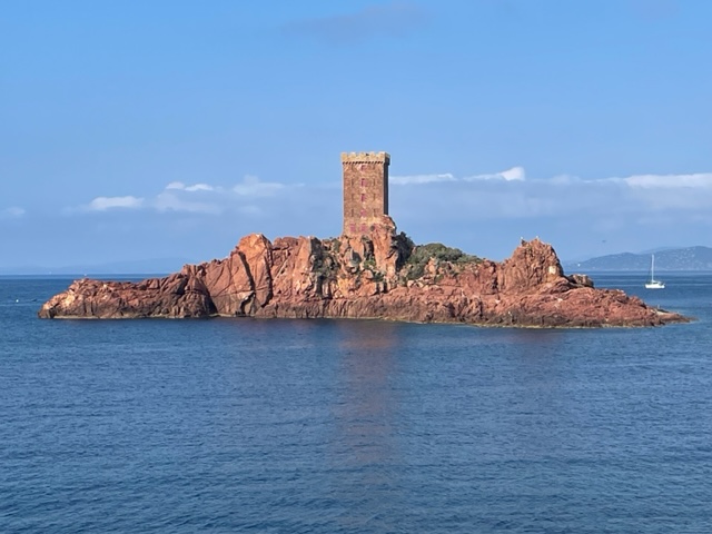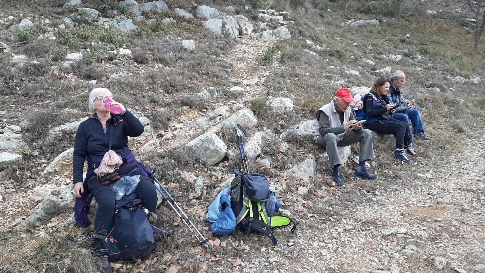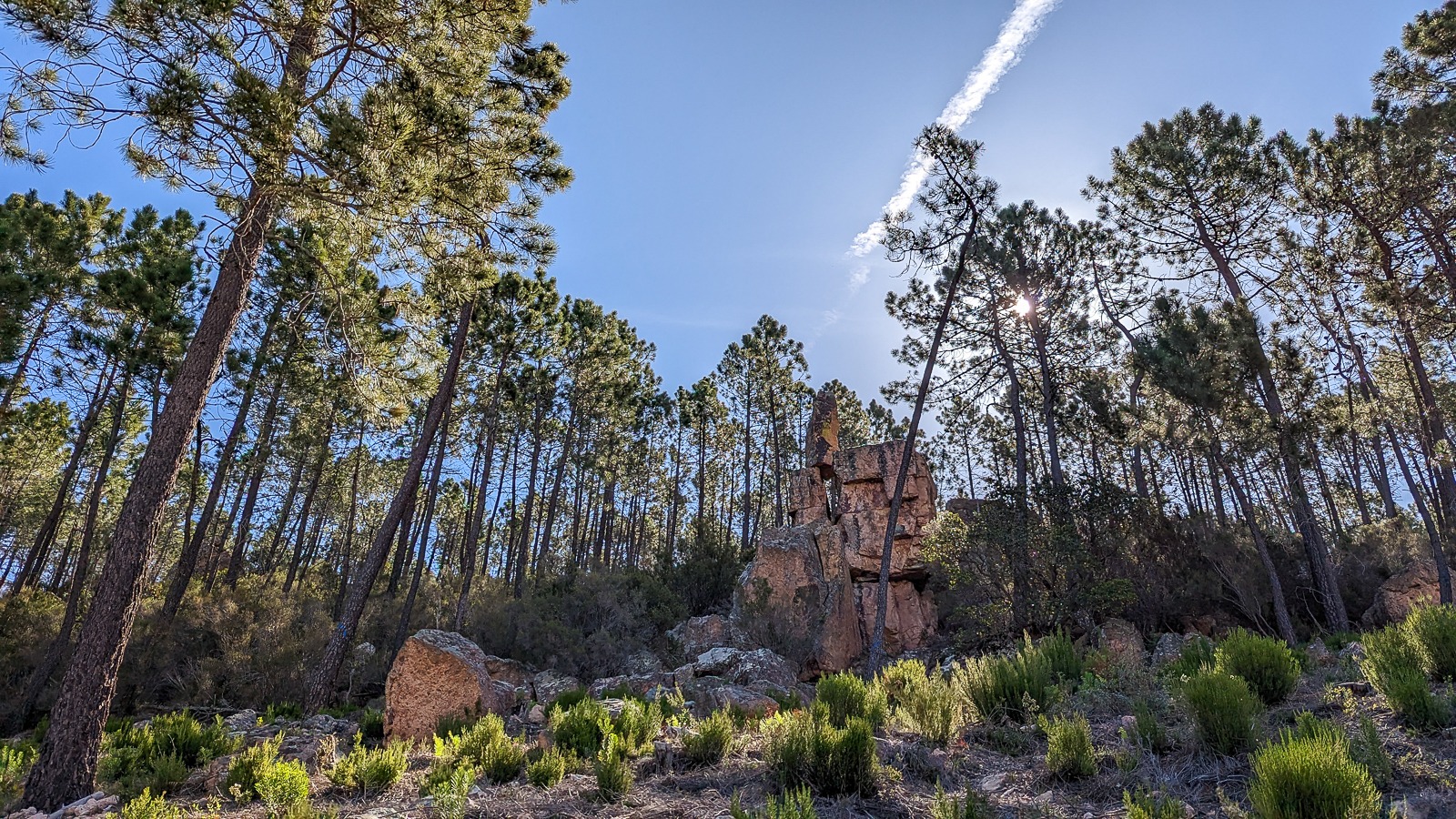 Un peu plus loin, après avoir quitté la route au niveau du monument en hommage à la famille de Martin Gray (son épouse et ses quatre enfants) disparue tragiquement lors du grand incendie du Tanneron en octobre 1970, nous sacrifions à la traditionnelle pause banane, confortablement installés et appuyés contre une paroi de rochers blonds et fauves qui ne sont pratiquement plus de l’Estérel, mais déjà des Maures.