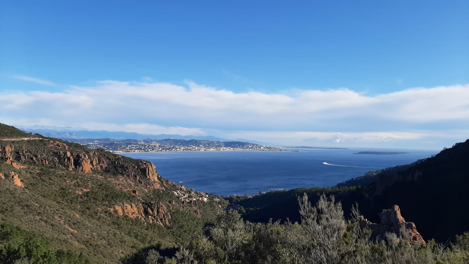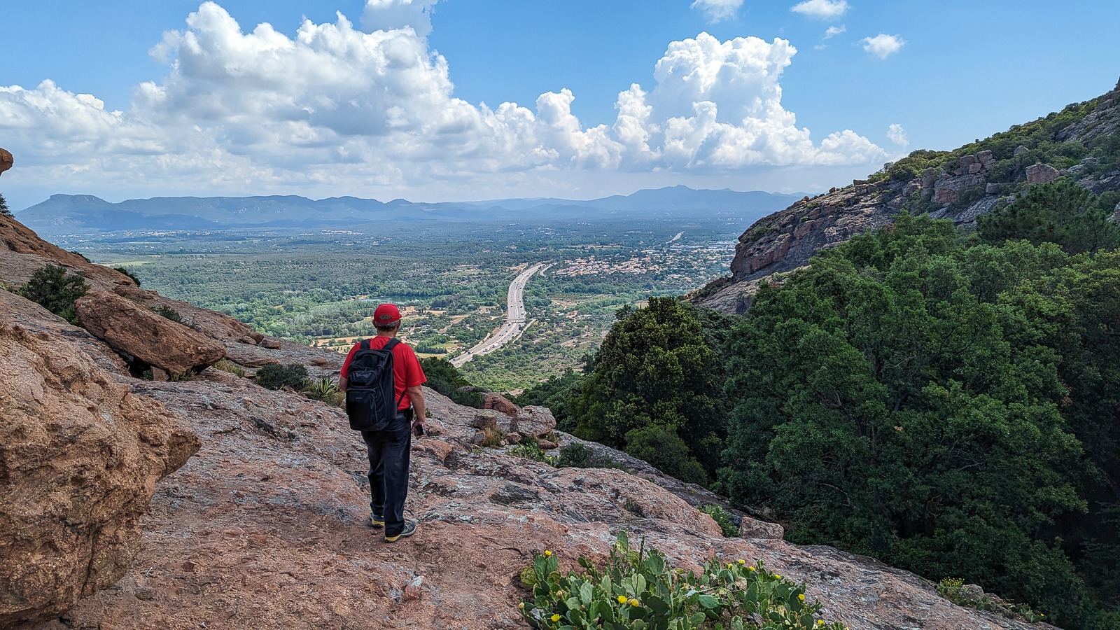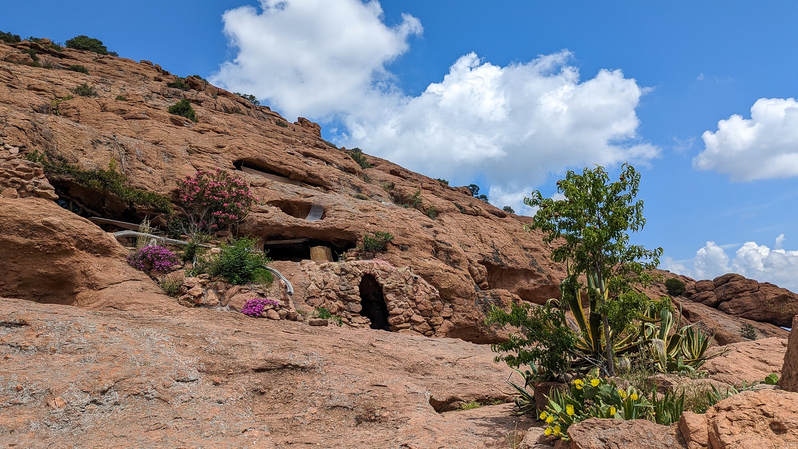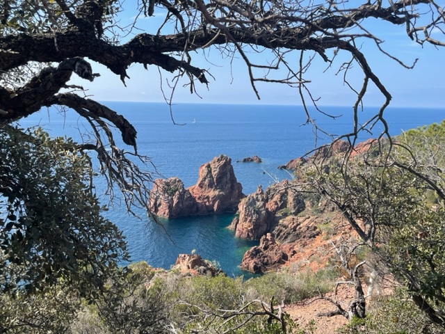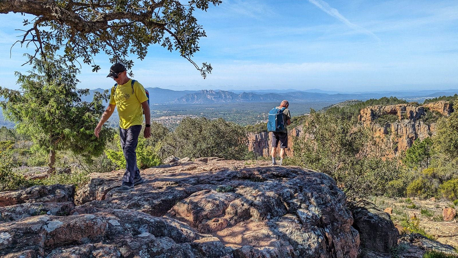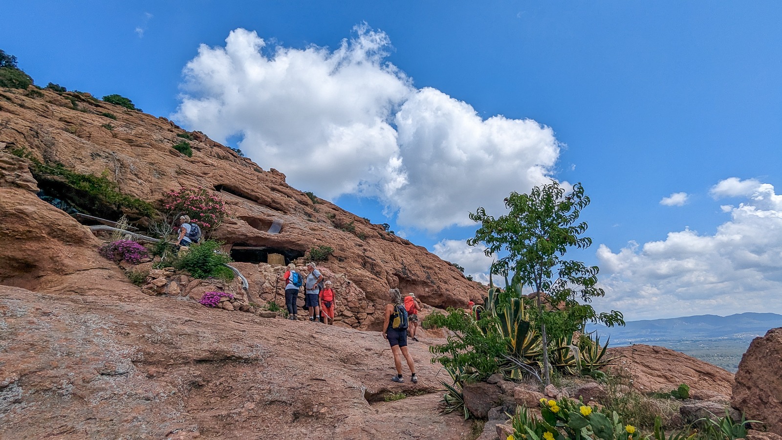 Quelques hectomètres plus loin, au niveau d’un grand carrefour, nous prenons l’étroit sentier du parcours de découverte qui nous donne à découvrir 33 bornes botaniques, abondamment illustrées, informant sur la faune et la flore de l’Estérel, avec ici et là, de nombreux et magnifiques points de vue sur le croissant lumineux de la baie de Cannes, les sommets du Mercantour recouverts d’hermine dans les lointains et la ville de Mandelieu à nos pieds, au plus près.