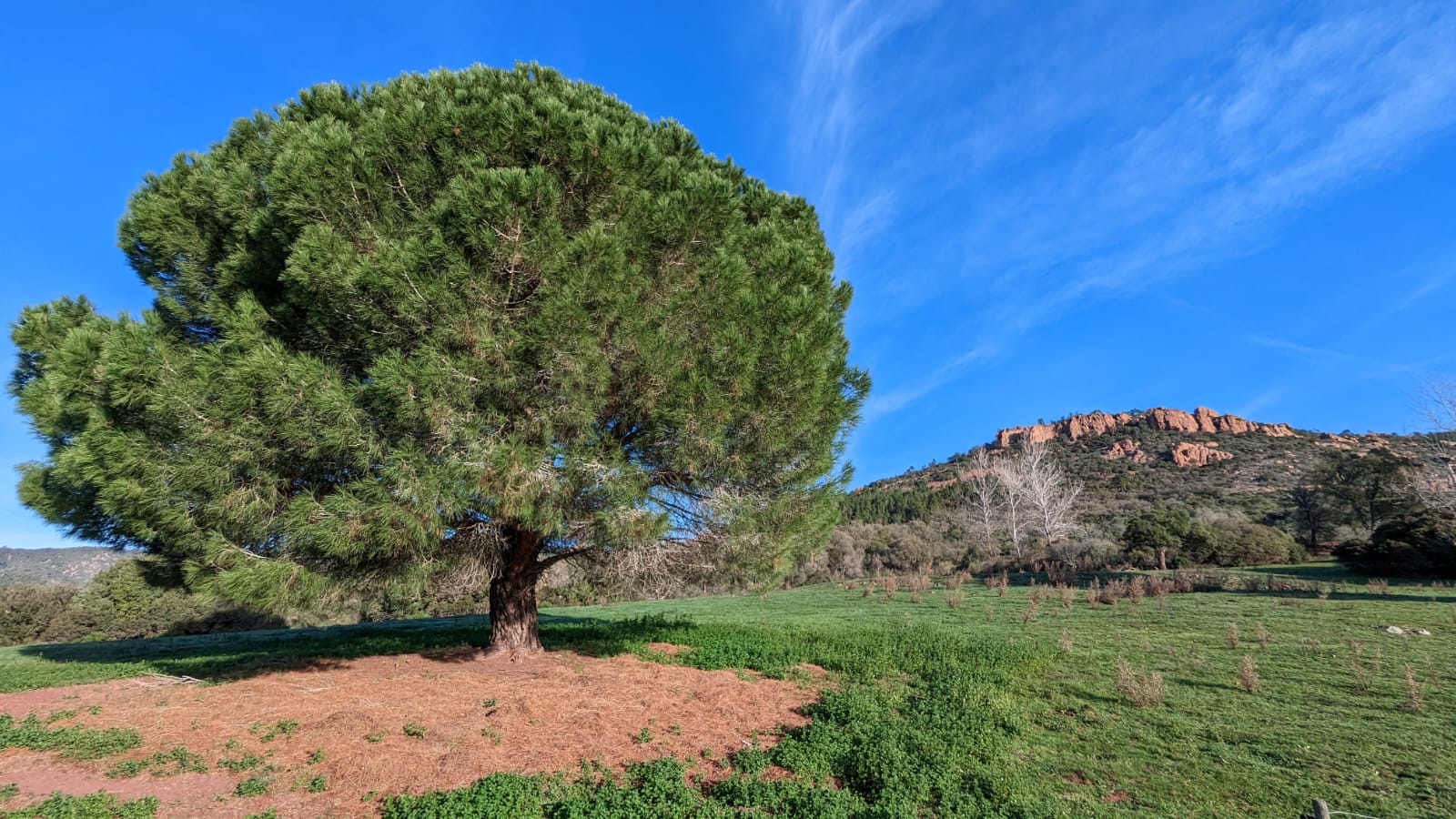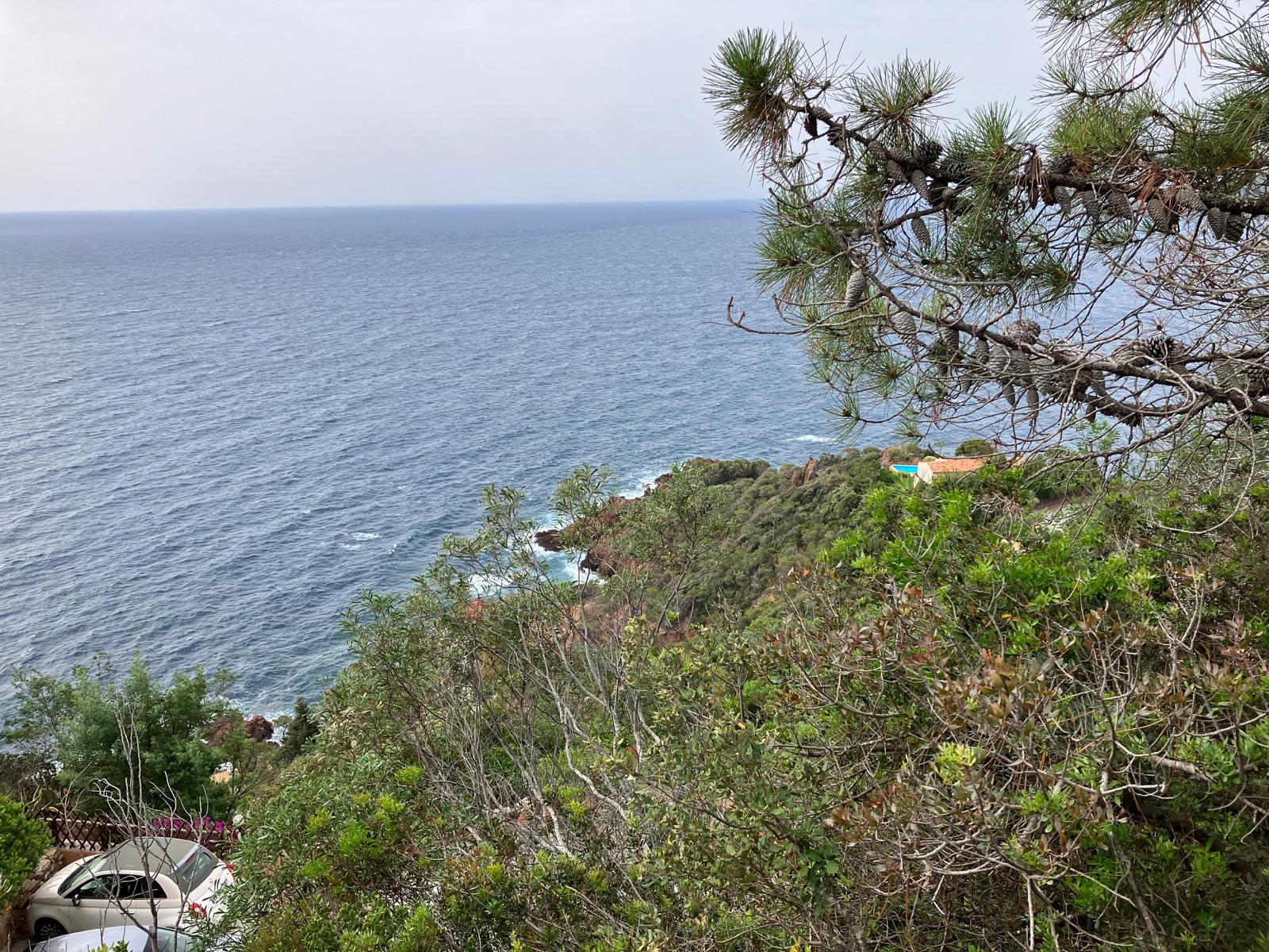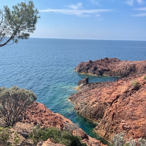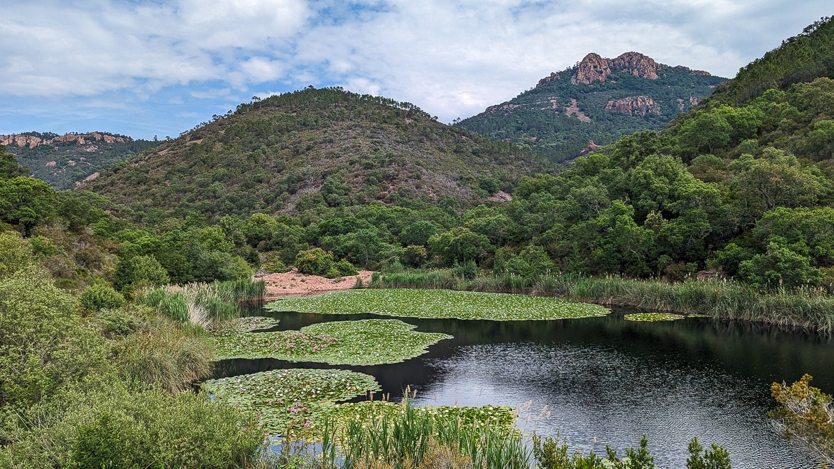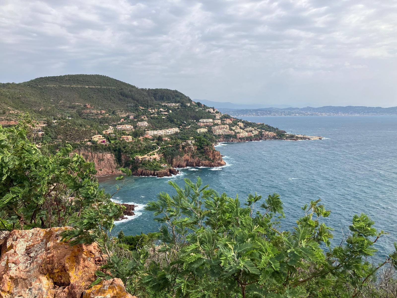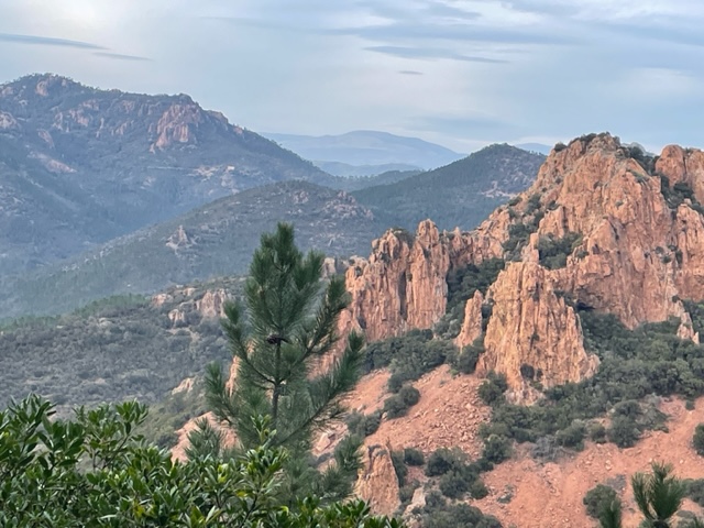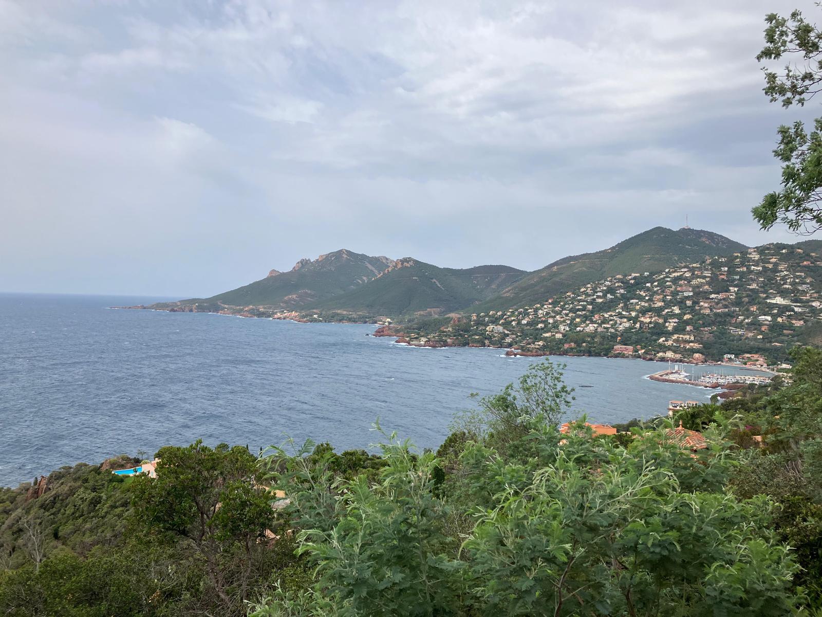 Quelques hectomètres plus loin, au niveau d’un grand carrefour, nous prenons l’étroit sentier du parcours de découverte qui nous donne à découvrir 33 bornes botaniques, abondamment illustrées, informant sur la faune et la flore de l’Estérel, avec ici et là, de nombreux et magnifiques points de vue sur le croissant lumineux de la baie de Cannes, les sommets du Mercantour recouverts d’hermine dans les lointains et la ville de Mandelieu à nos pieds, au plus près.