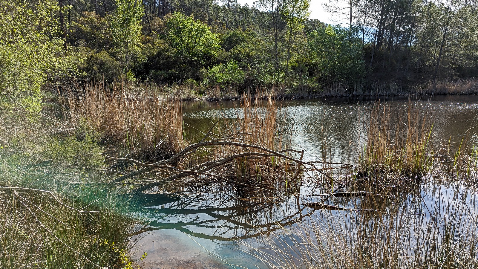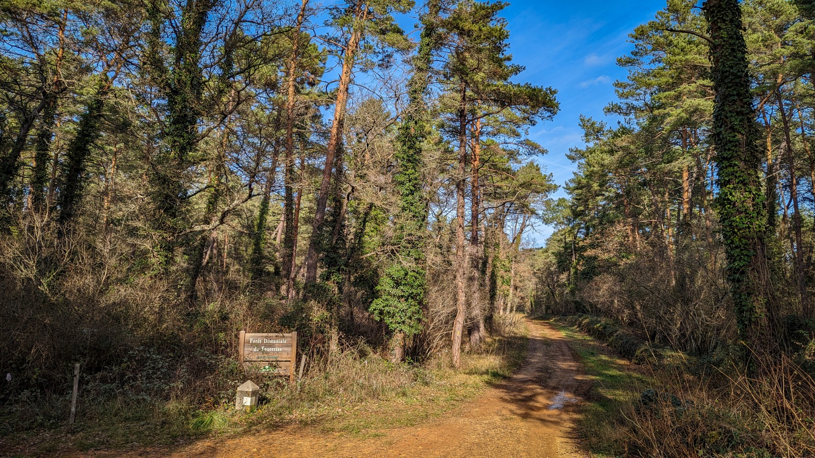 Après avoir traversé prudemment la D92, on emprunte d’abord la large et confortable piste de Barbossi, déjà bordée par des centaines de mimosas à la floraison exubérante et étincelante.