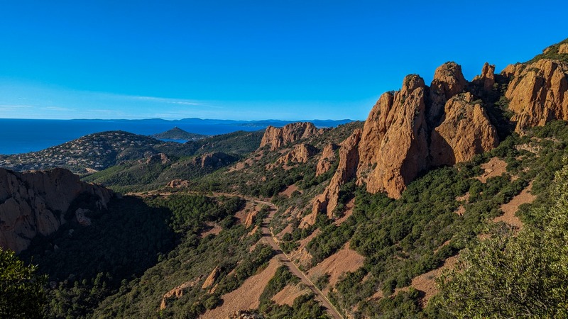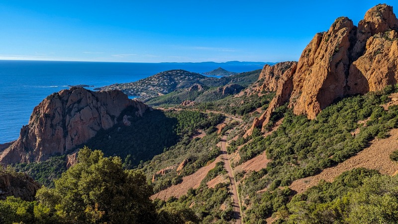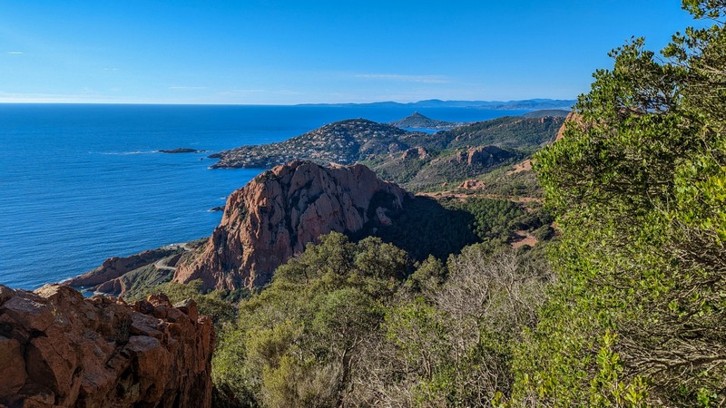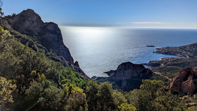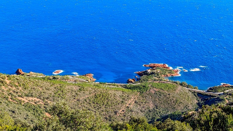 Sous les pieds, le bleu cobalt, profond, de la mer immense et insondable, devant les yeux éblouis, l’incarnat incandescent des rochers de Rhyolite de l’Estérel et, au-delà, jusqu’à l’horizon le plus lointain, le déroulé des golfs, des calanques et des criques qui ourlent les rivages déchiquetés d’une dentelle d’écume blanche, pareille à une légère mousseline.
